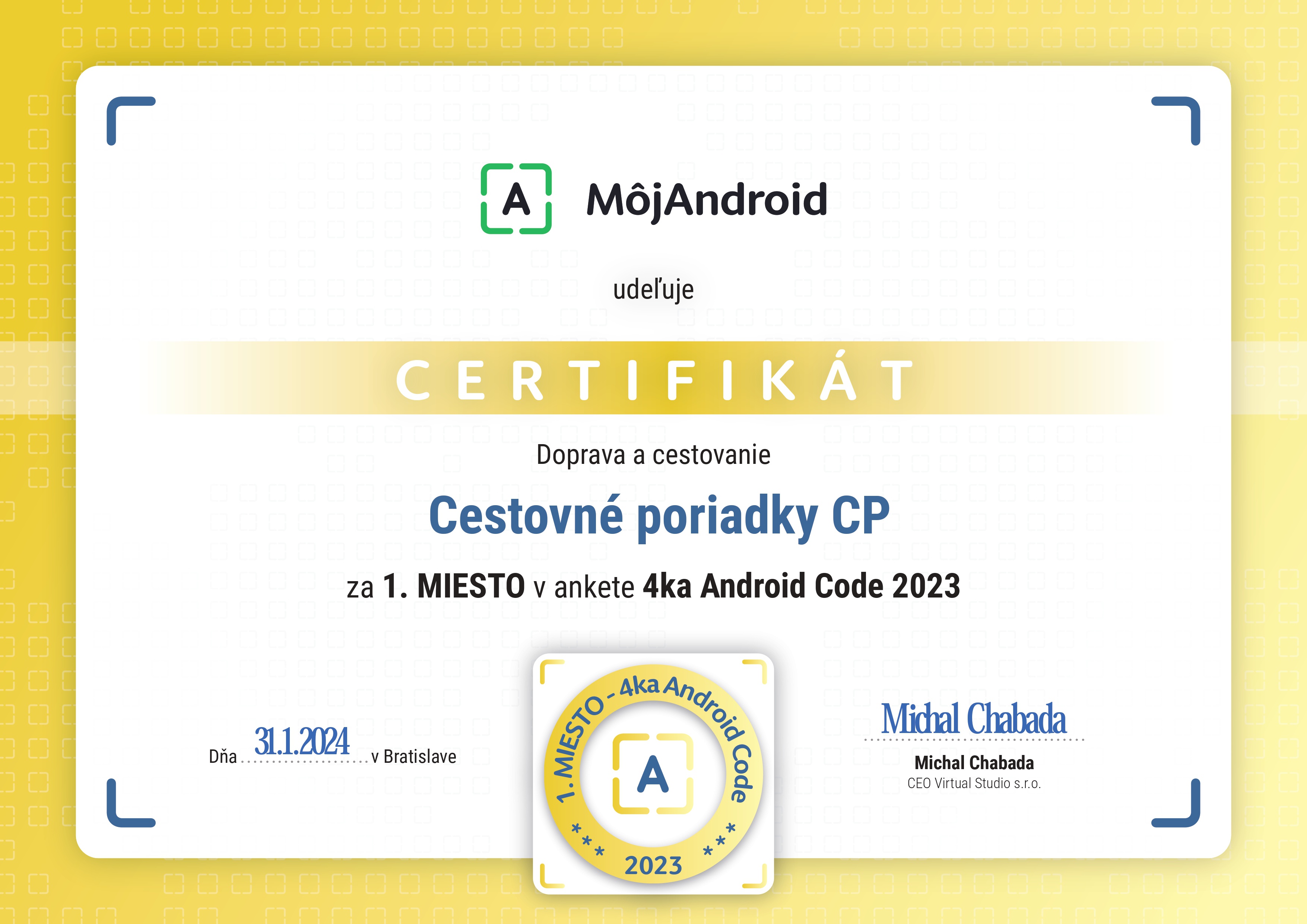 Our mobile app Cestovné poriadky CP for Android once again took first place in the Transportation category in the MojAndroid.sk server survey 4ka Android Code 2023, which ran from 11/28/2023 to 12/31/2023.