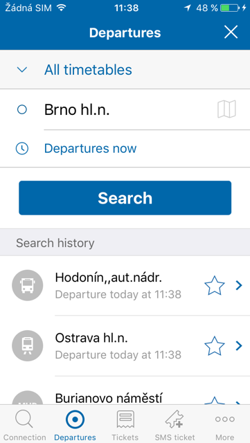 The IDOS website for mobile phones can be used on any mobile phone with an Internet connection at https://m.idos.cz/ (see also IDOS pro internet).